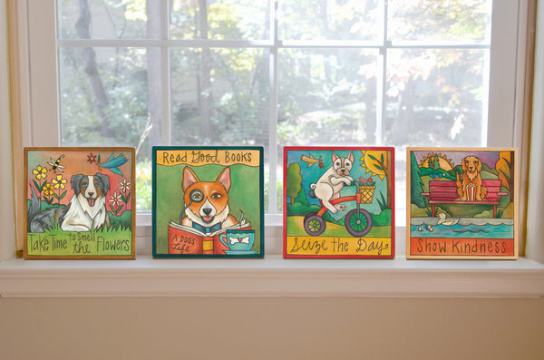 Decorative sign with a french bulldog on a bicycle and 'Seize the Day' text, placed indoors.