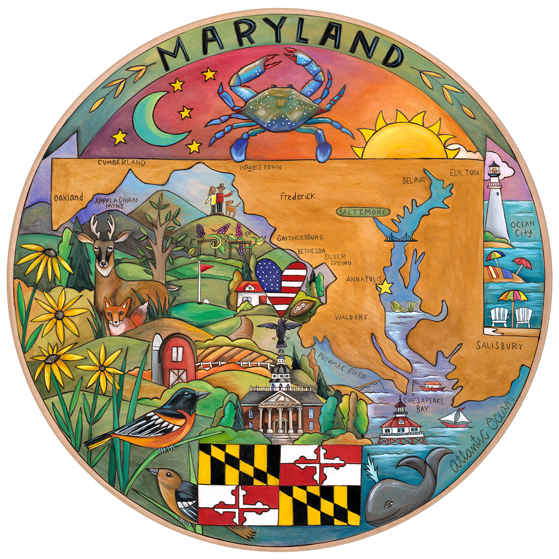Beautiful artisan printed Maryland lazy susan with a map of the state highlighting some of the most beloved areas in it