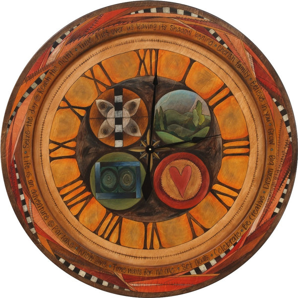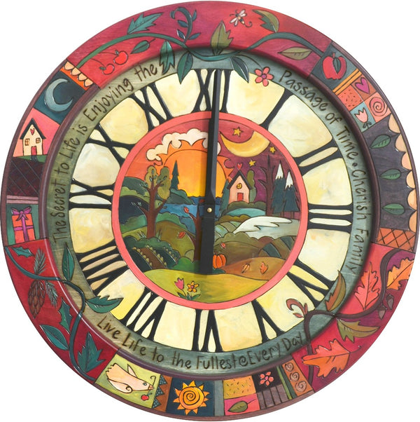 Sticks handmade 36"D wall clock with four seasons landscape and colorful life icons