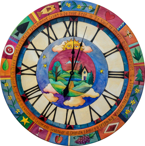 Sticks handmade 36"D wall clock with sunrise landscape and colorful life icons