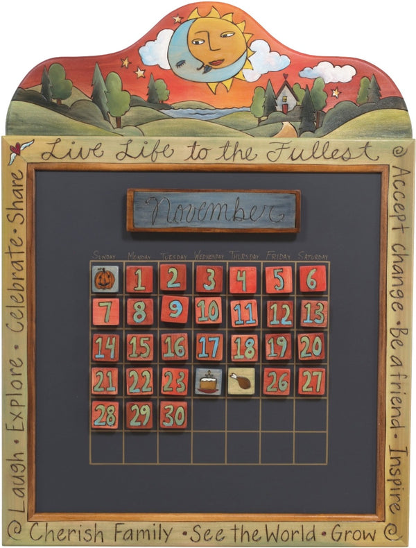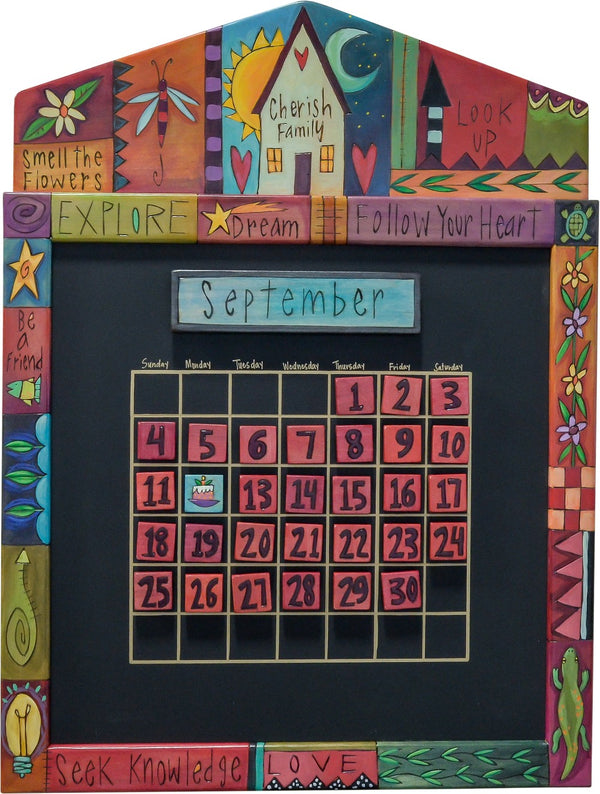 Our handmade perpetual calendars made of wood are not just ordinary calendars. They are magnetic wall calendars featuring folk art, hand-painted designs that make them stand out from the rest. With our magnetic perpetual calendar, you can easily change the calendar monthly and personalize important dates using our handmade magnets. It's a great tool to teach children about days of the week and months. The black magnetic chalkboards of our wooden perpetual calendars make them perfect for an office or kitchen to keep everyone informed.