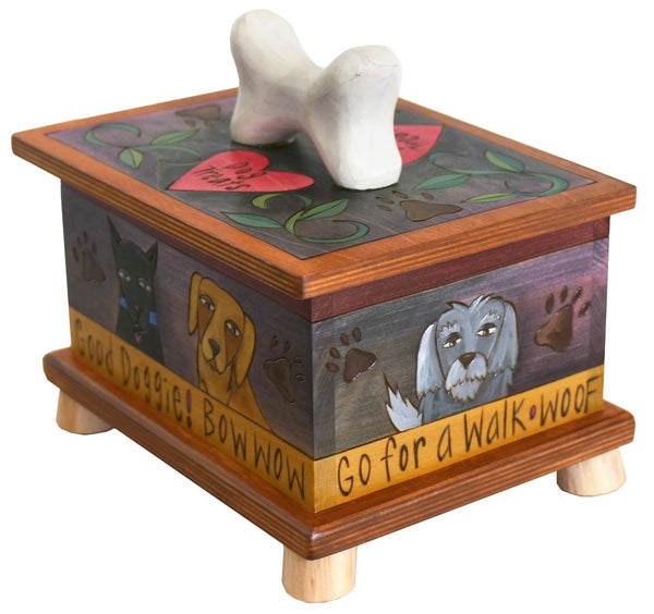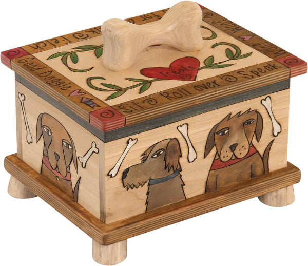 Treat your pets! Sticks pet treat boxes are crafted with wood-burned and hand painted details. Our treat containers can hold plenty of delicious goodies and bones for all of your furry friends.