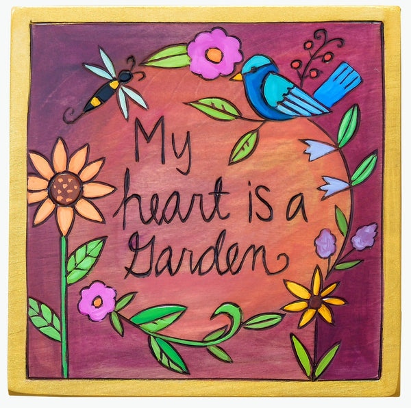7"x7" Plaque – Cute "my heart is a garden" plaque with a bird and bee accents