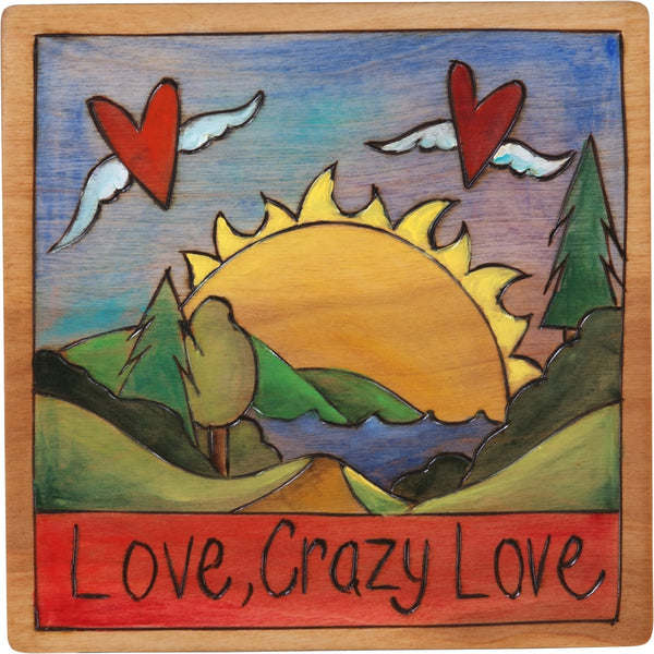 7"x7" Plaque –  "Love, crazy love" hearts with wings floating about a landscape design