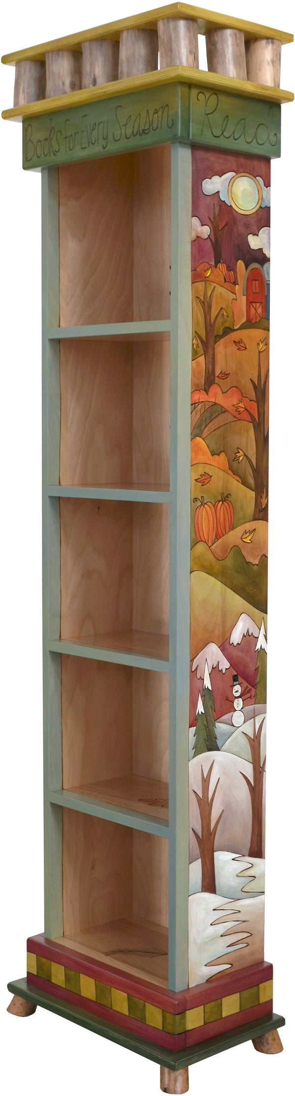 Tall Bookcase –  Lovely rolling landscapes bookcase with four seasons motifs