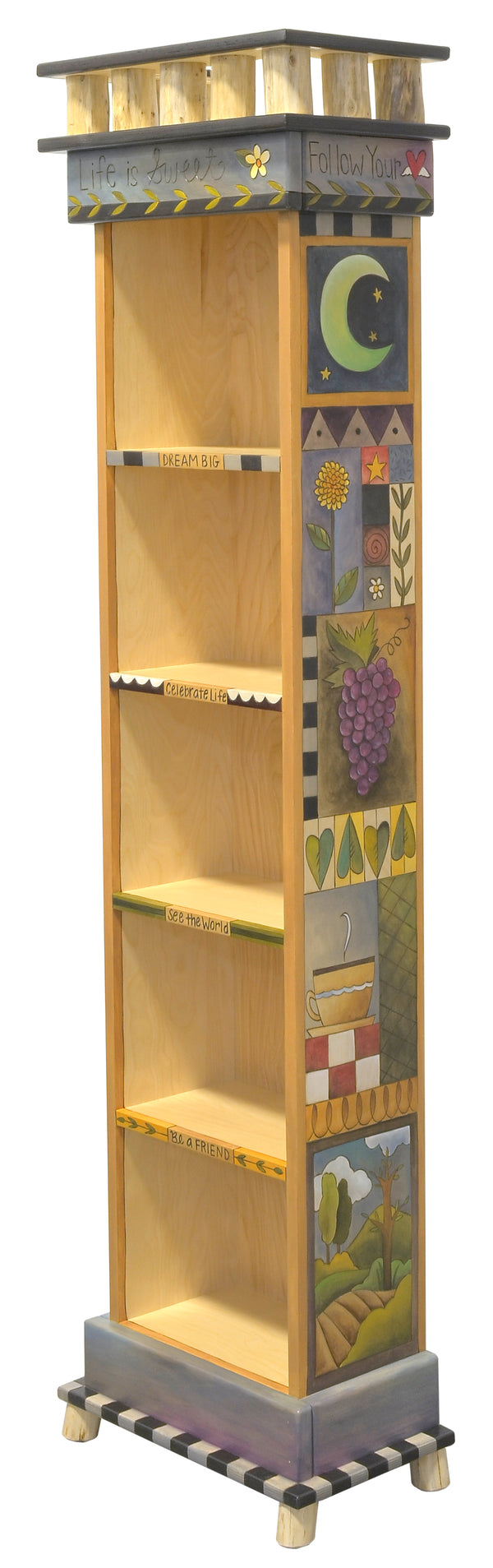 Tall Skinny Bookcase –  "Live is sweet" bookcase with short, sweet phrases down fronts of shelves and crazy quilt designs down the sides side view