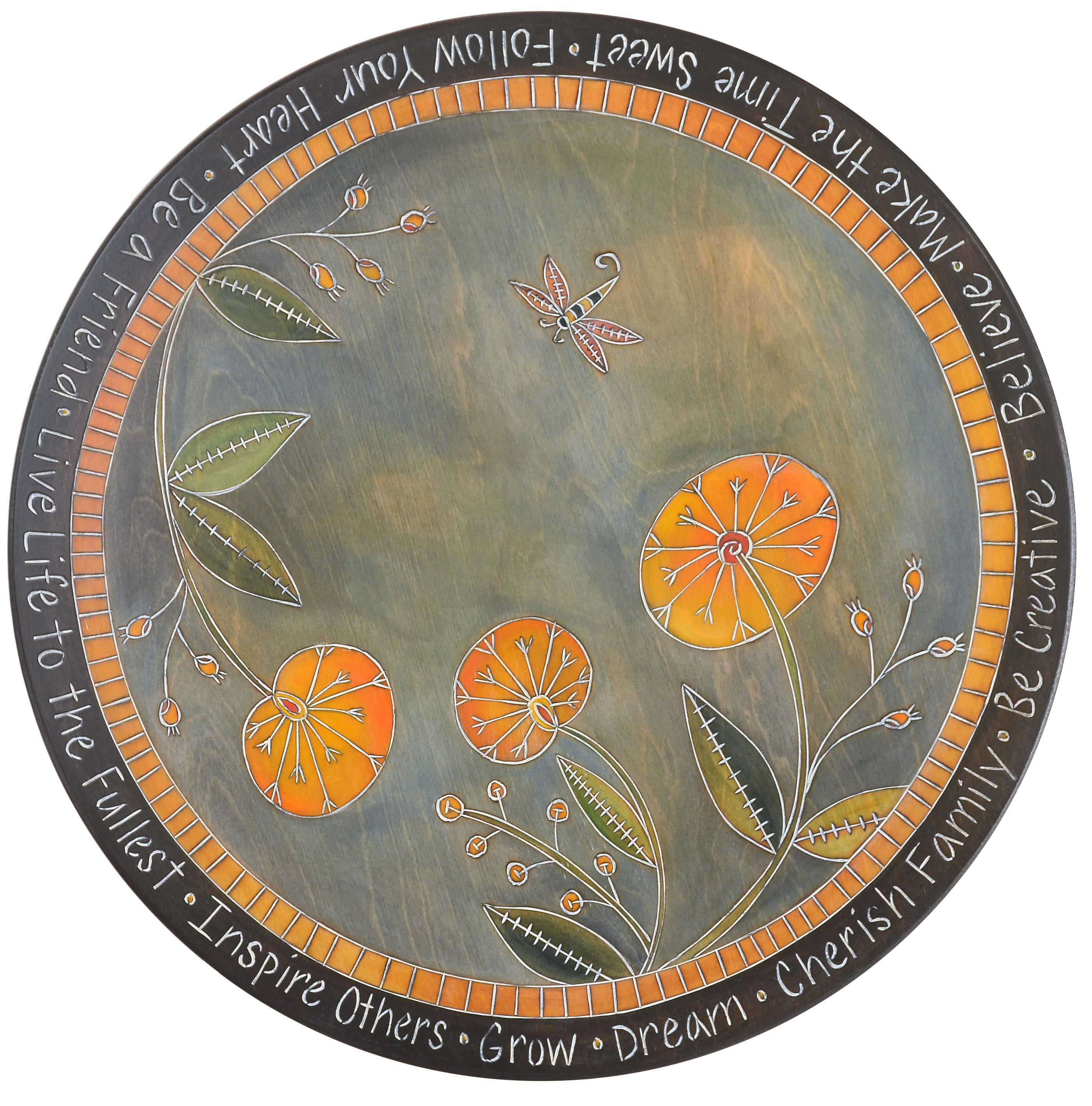 Stunning contemporary floral lazy susan painted in blues and yellows with scratchboard treatment all over