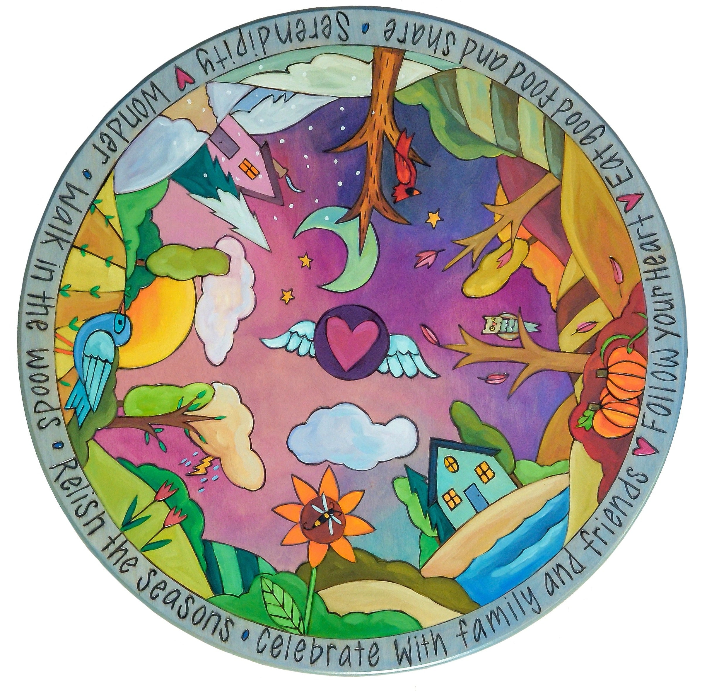 Whimsical four seasons lazy susan design with a heart with wings floating in the sky