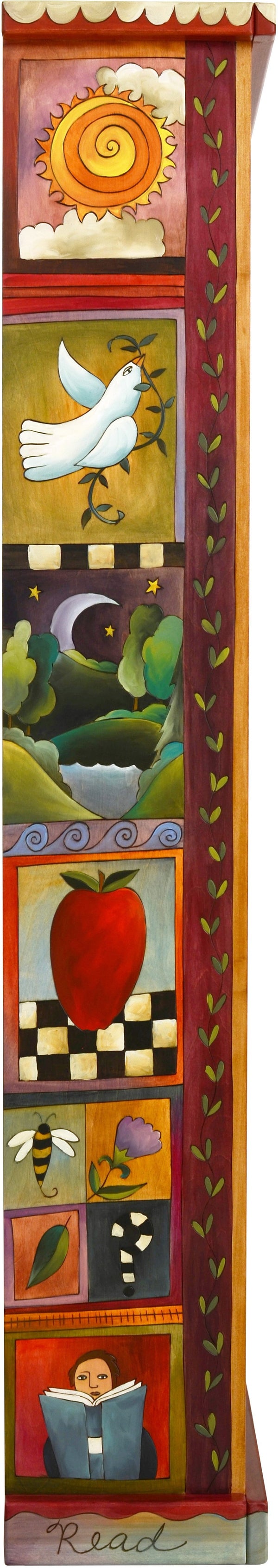 Lovely tall bookcase with dark interior and colorful block icon motif on the sides