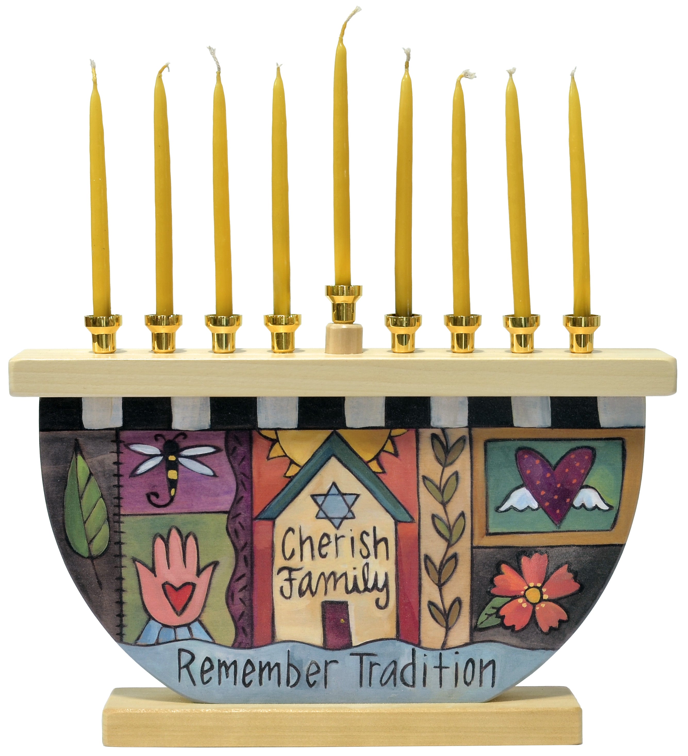 "Remember Tradition" Colorful patchwork design on a wooden menorah