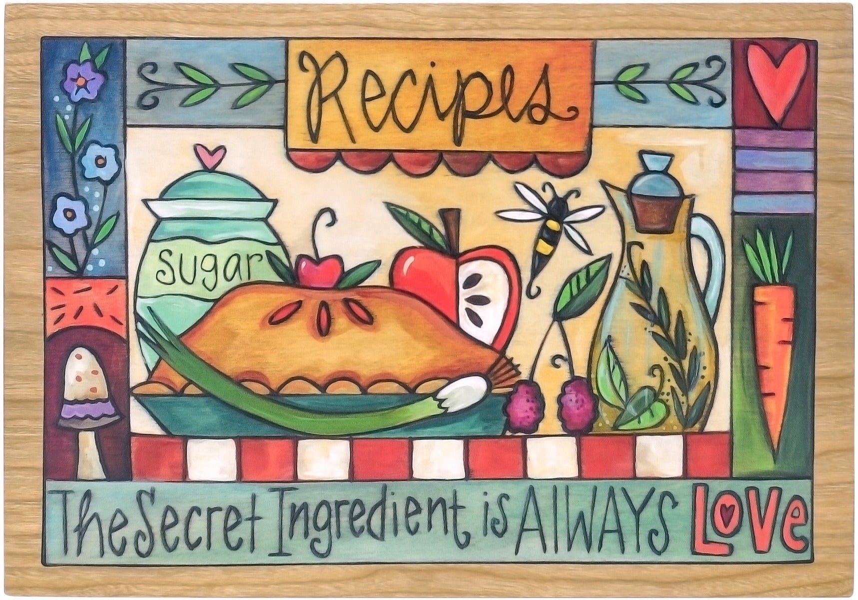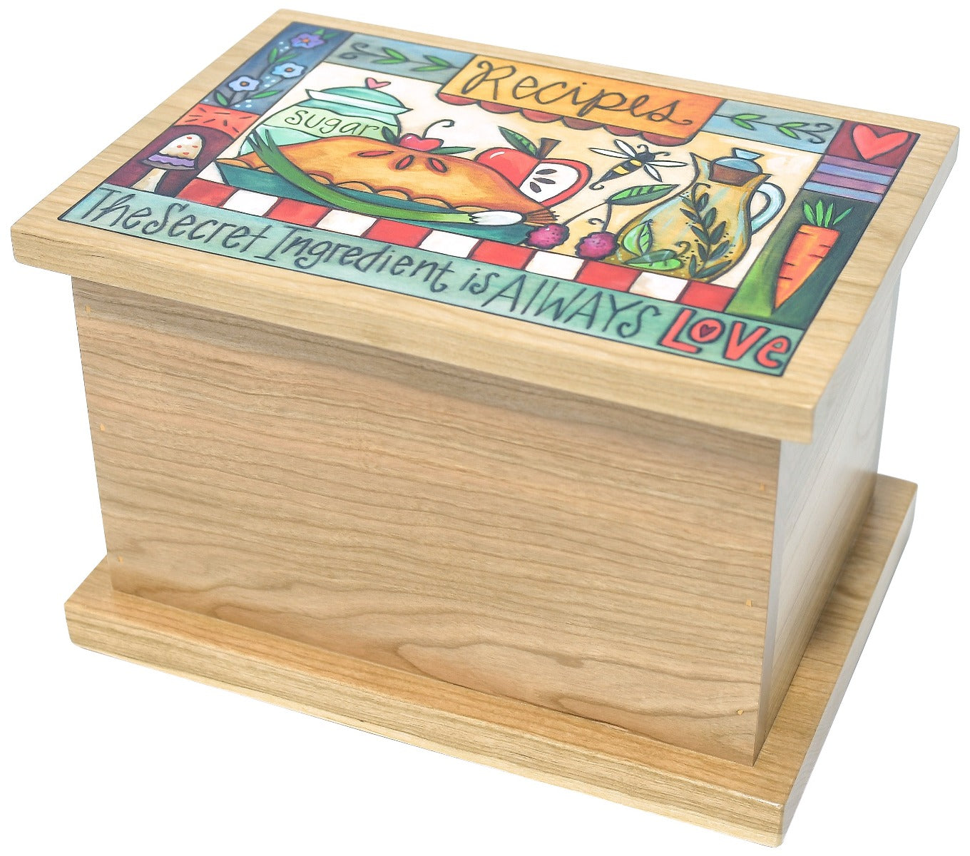 Wood recipe box with printed design of a delicious spread of food on the lid