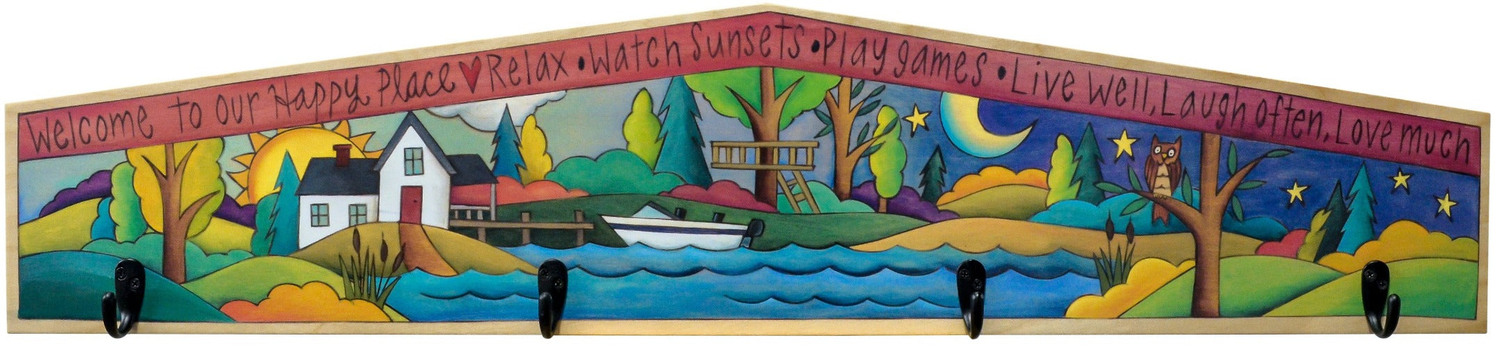 A lake-themed landscape design coat rack to honor your favorite serene getaway