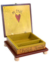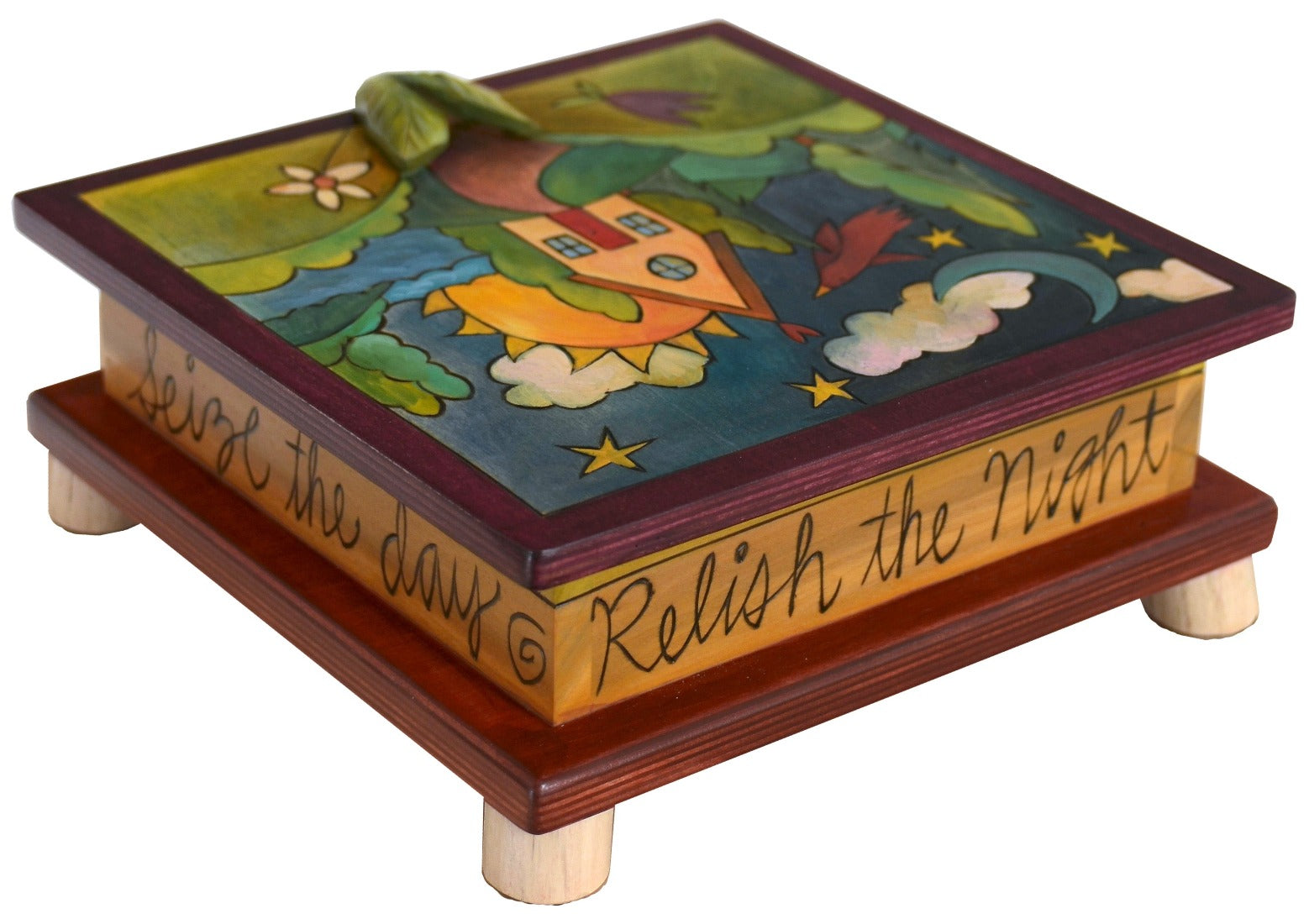 Lovely landscape with home in front of a lake design and "my stuff" inscribed inside the lid