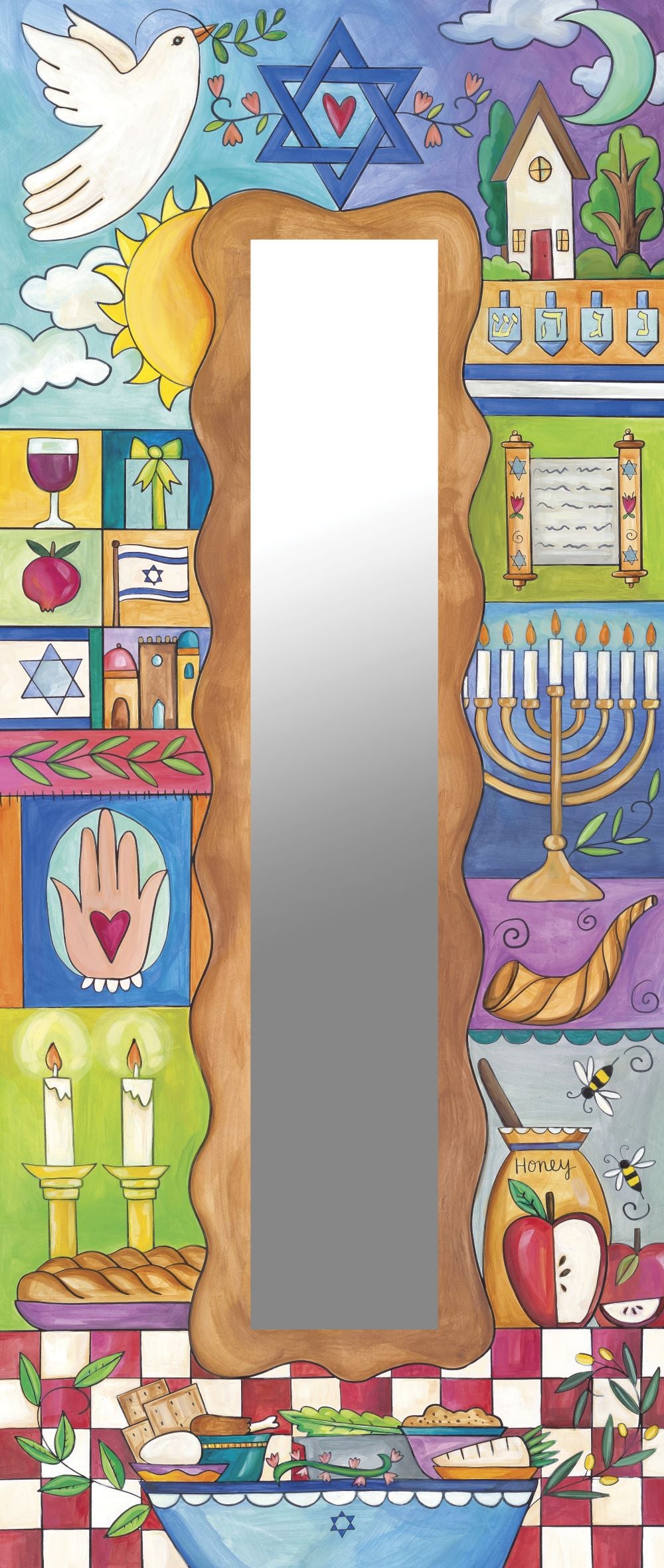 A rectangle mirror with Judaica boxed icons celebrating traditions