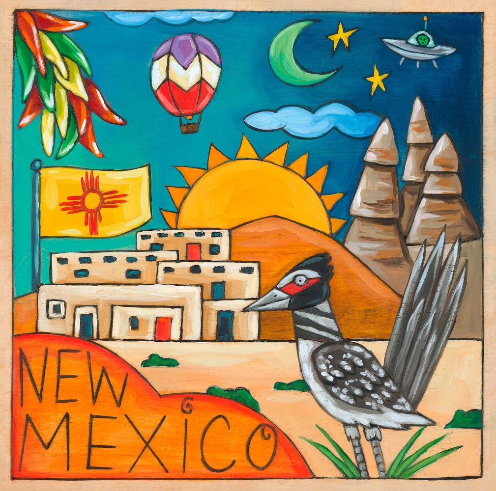 Eclectic design of New Mexico symbols surrounding its desert landscape