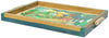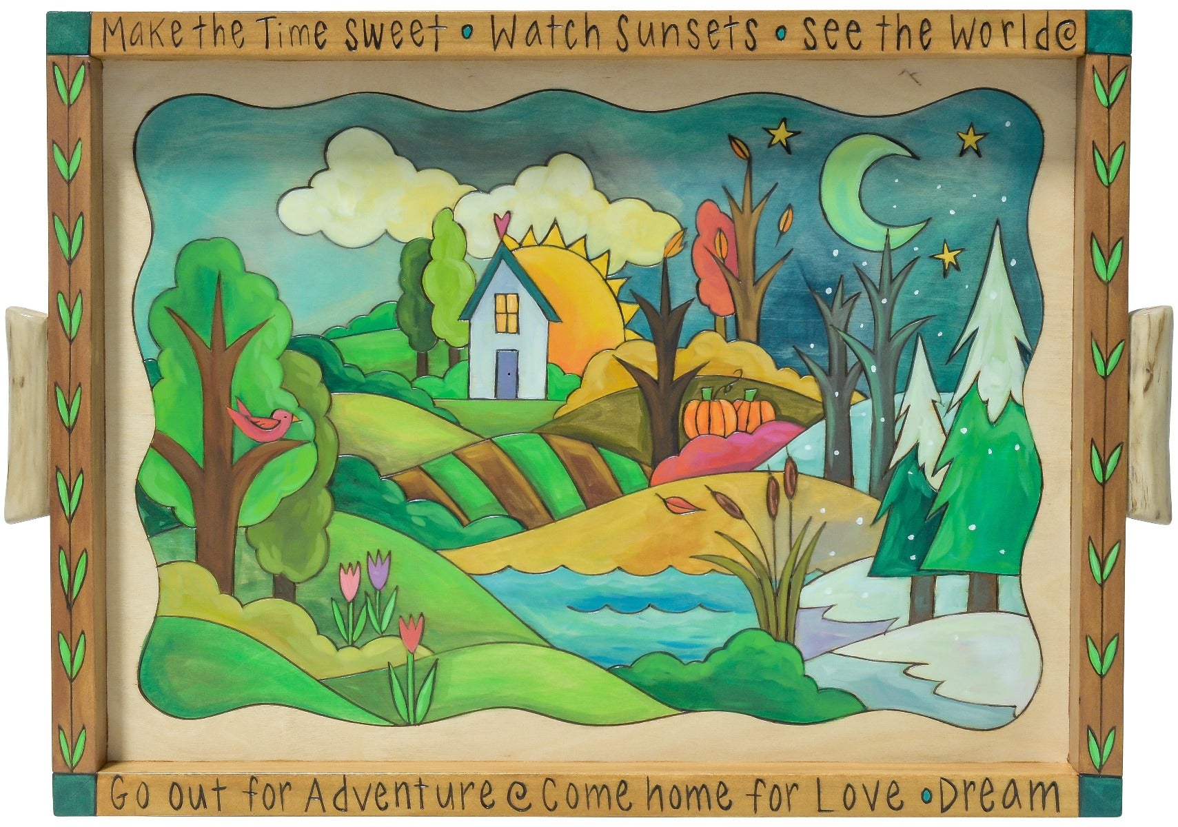 Brightly painted tray with four-seasons motif and inspirational phrases around the border