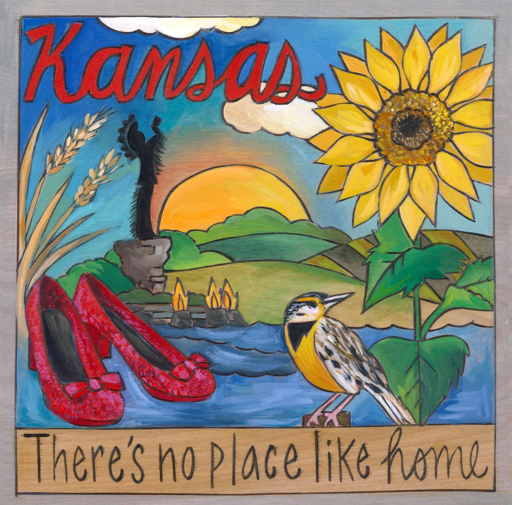 A lovely Midwest landscape scene featuring the Keeper of the Plains sculpture and ruby slippers