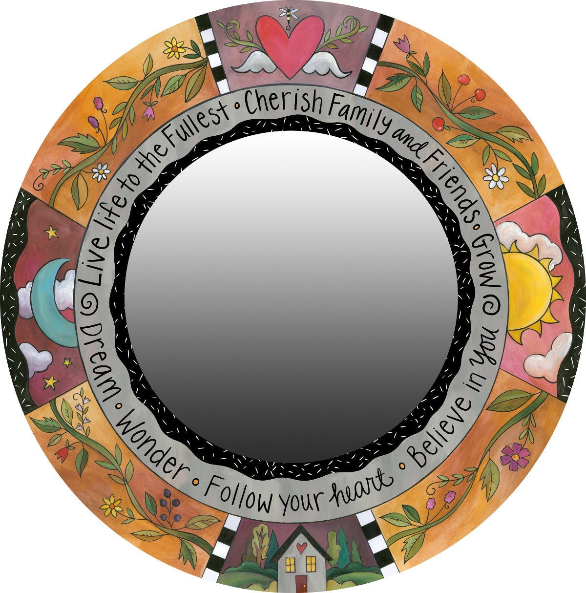 Charming floral vine mirror motif in a warm color palette and black and white accents