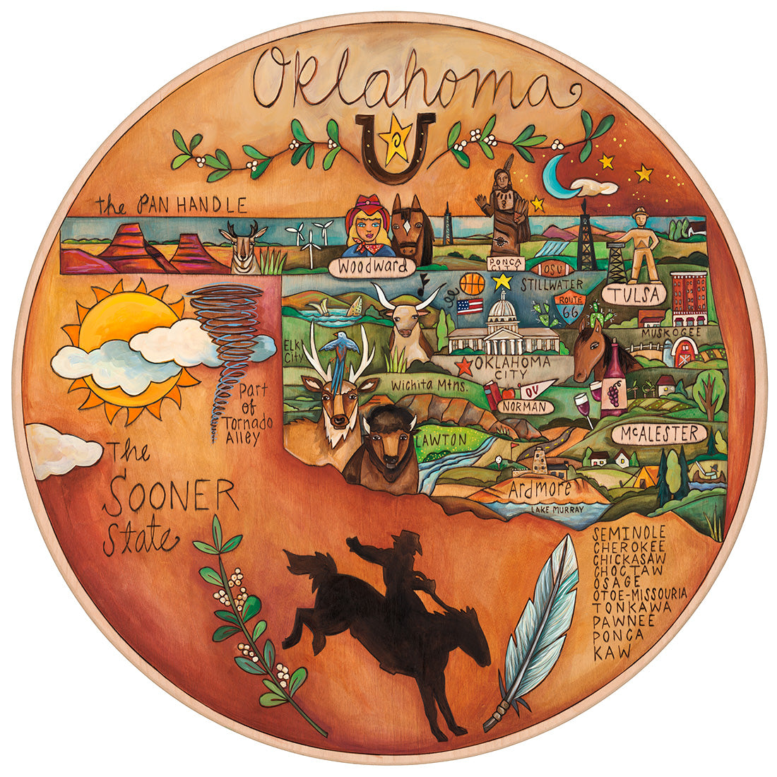 A gorgeous painted map of Oklahoma's unique landmarks and wildlife on a functional lazy susan.