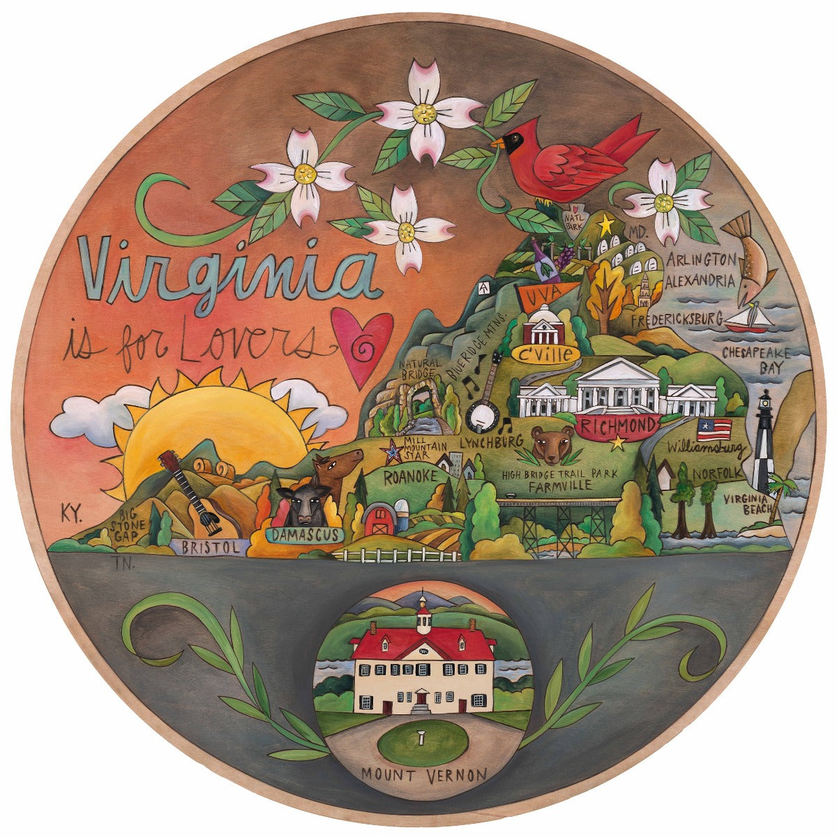 "Virginia is for lovers" lazy susan with state outline and a featured Mount Vernon estate