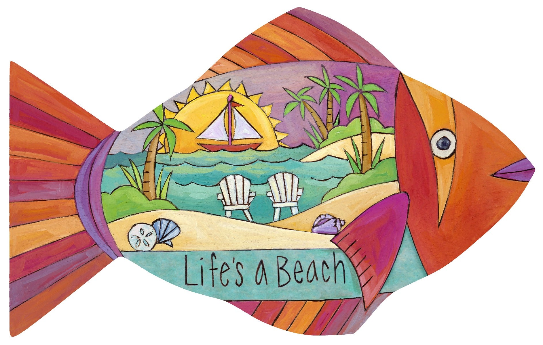 "Life's a beach" fish-shaped wall art with a balmy beachfront motif