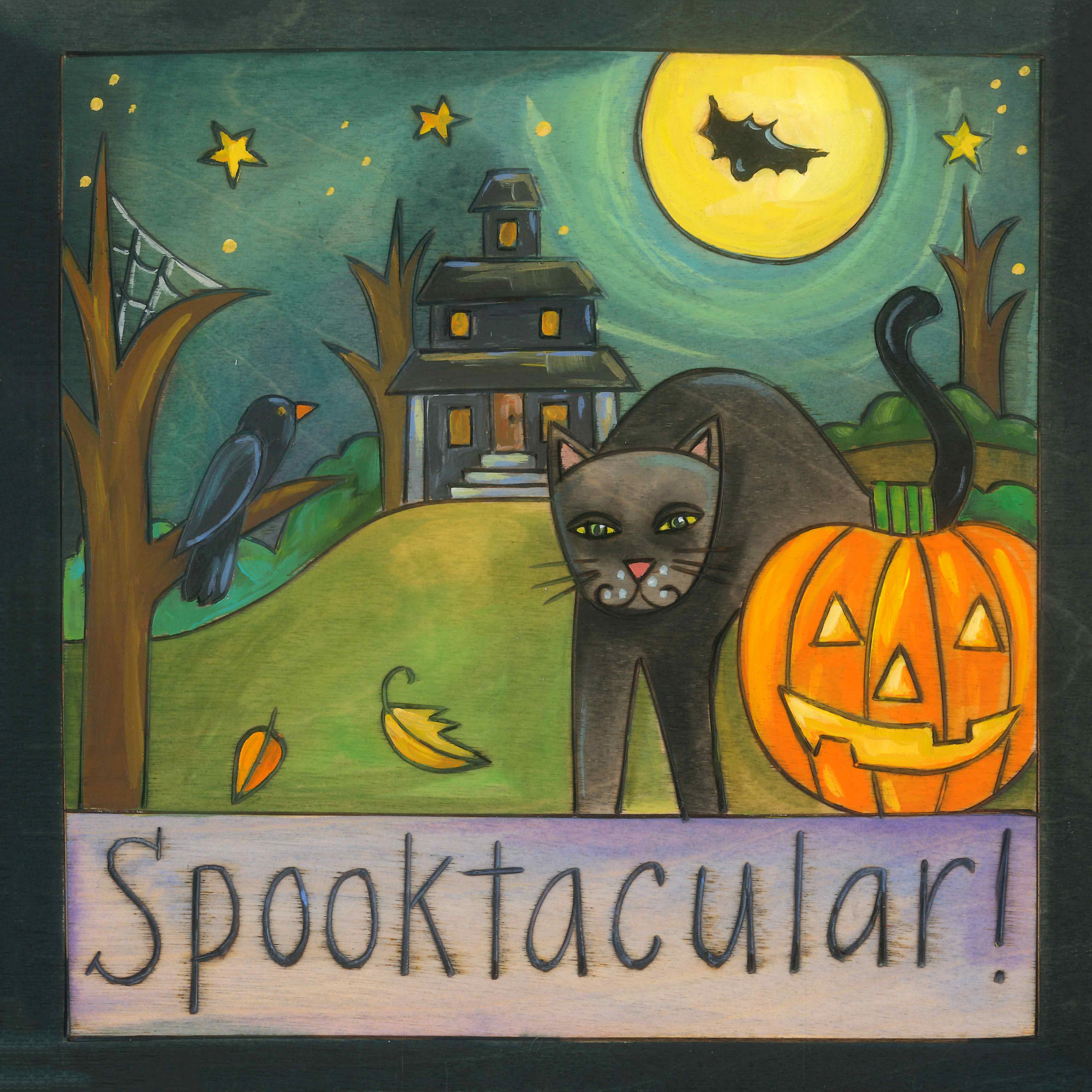 An adorably spooky Haunted House landscape on a wood wall plaque