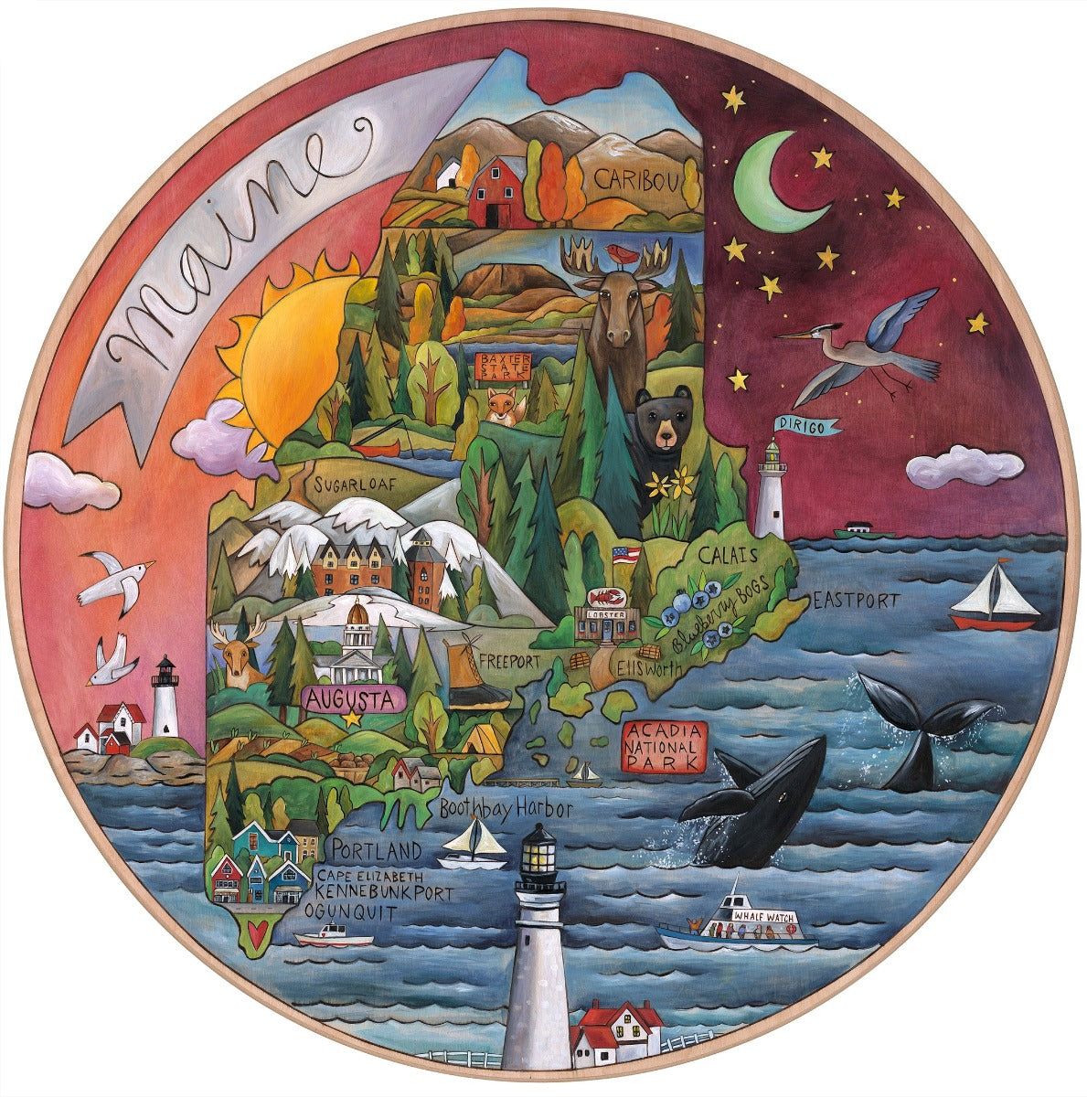 Beautiful artisan printed Maine lazy susan featuring the state's landscapes and its main attractions