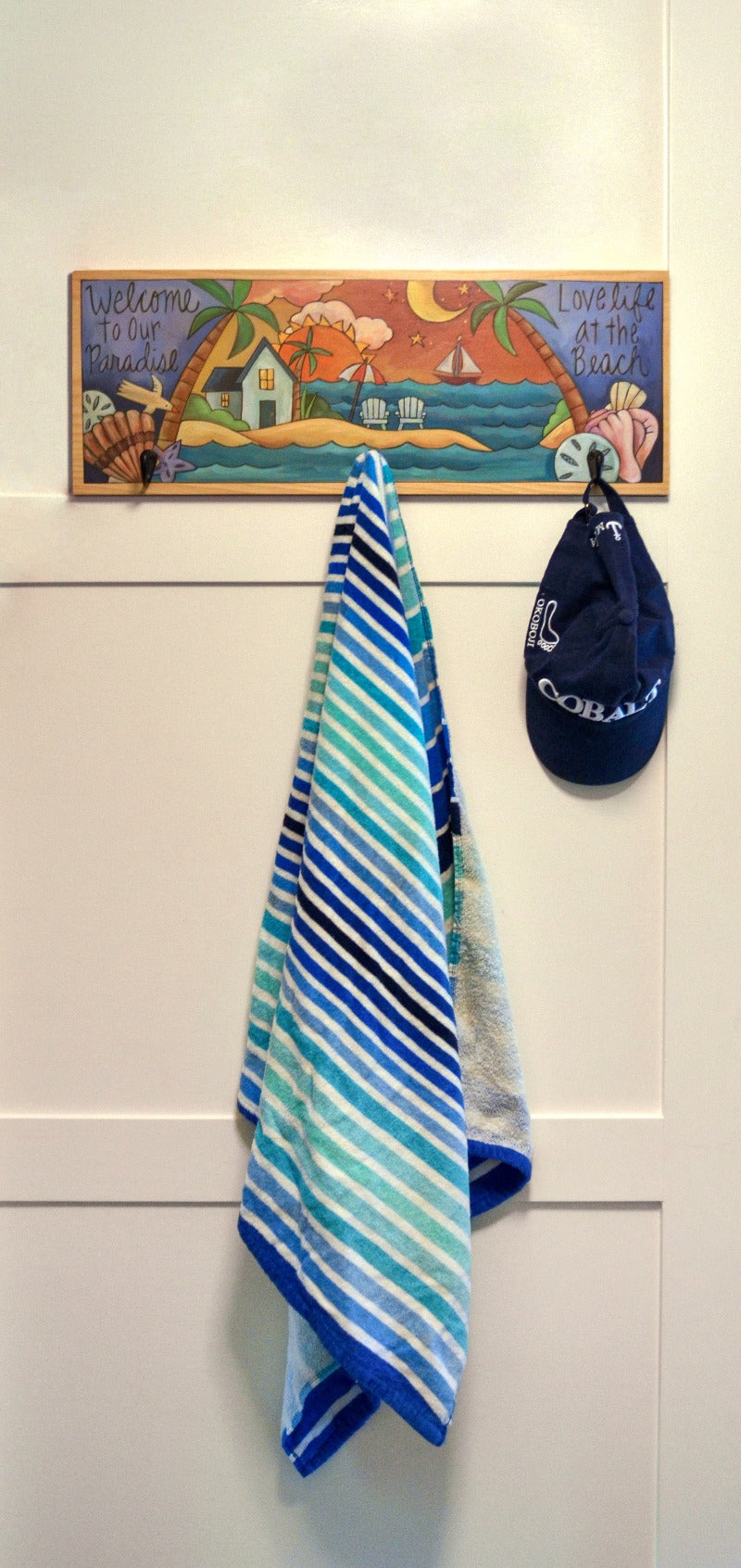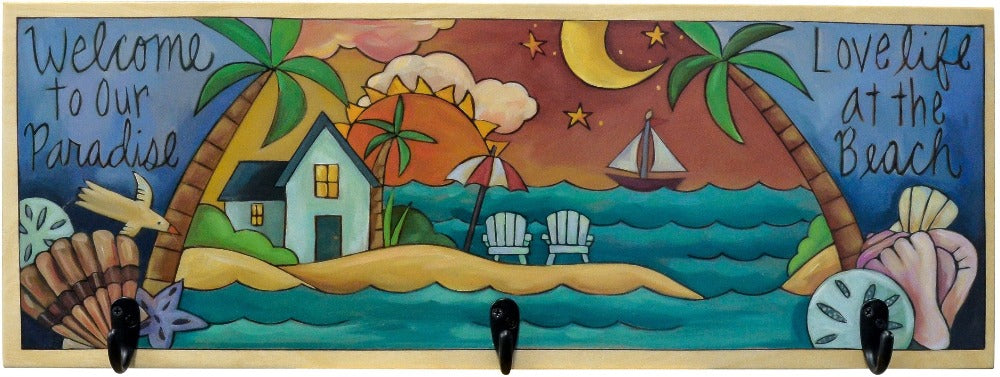 Tropical themed landscape coat rack to hold your towels and beach bags after enjoying a day in paradise